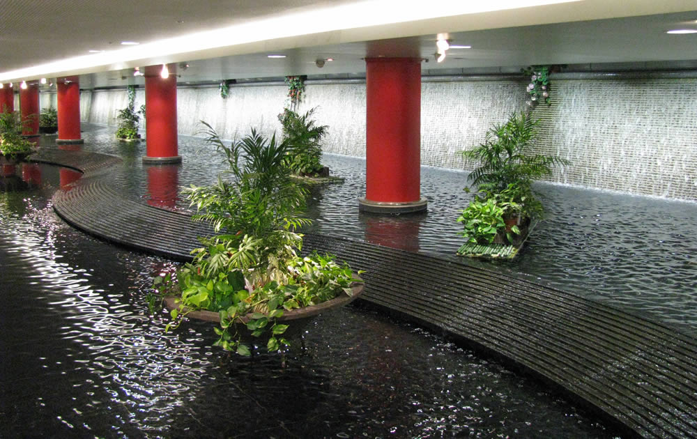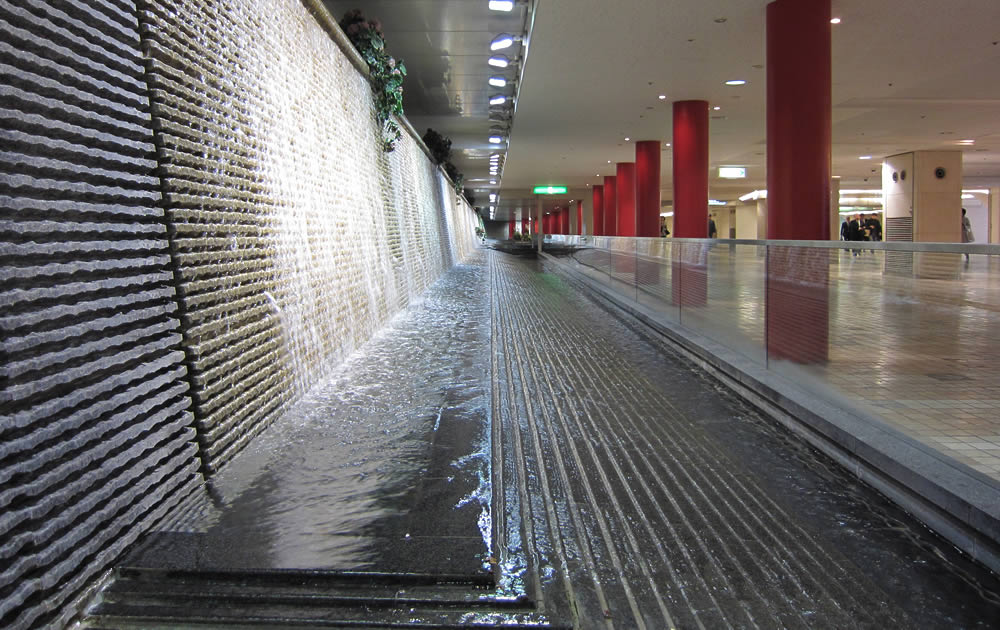 約80メートルの滝と池が地下空間に潤いを演出 The almost 80-meter waterfall and pond below provides moisture for the underground space