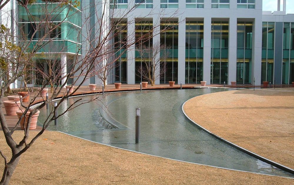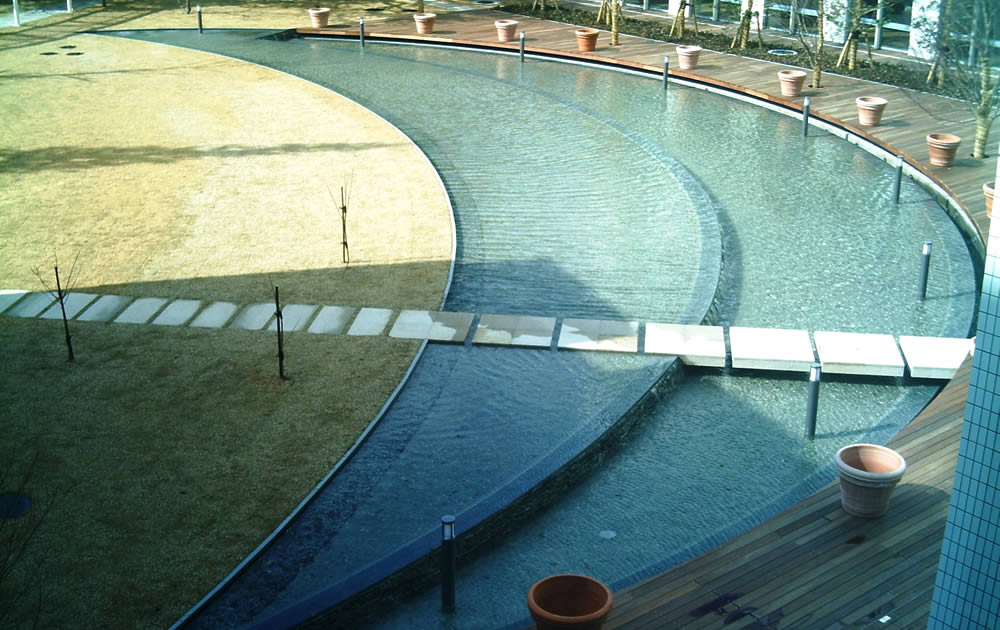 三日月状の意匠が親しみを誘う癒しの水辺 Tokushima Sekijuji Hospital This crescent-moon shaped calming water feature invites familiarity