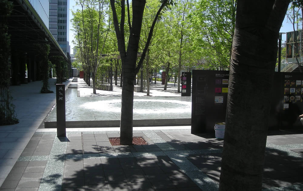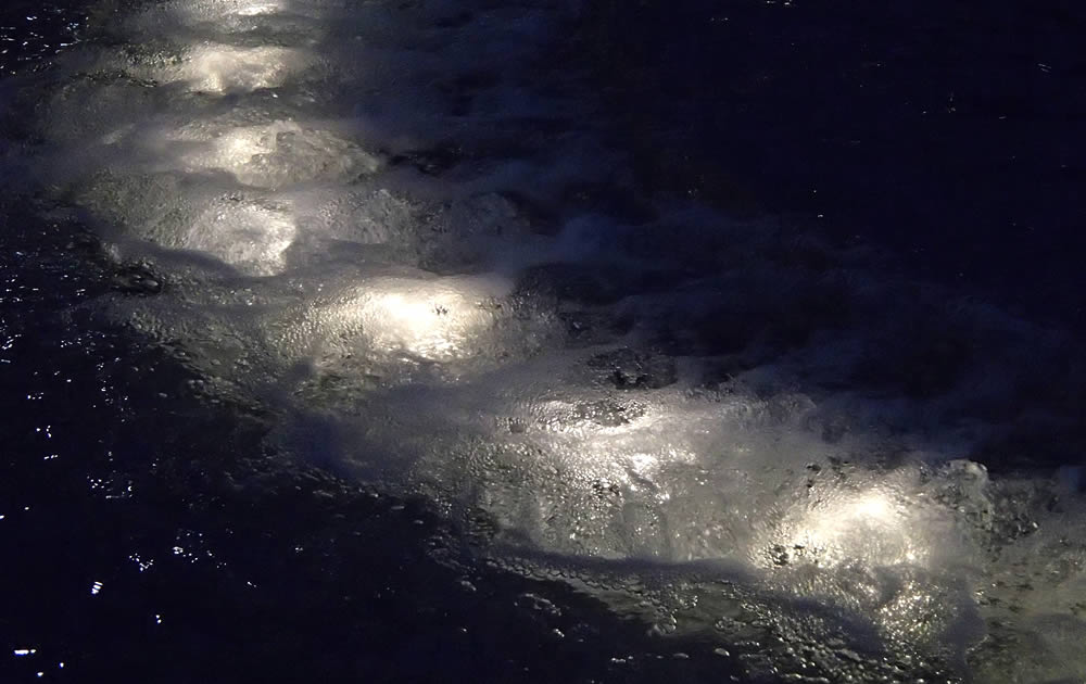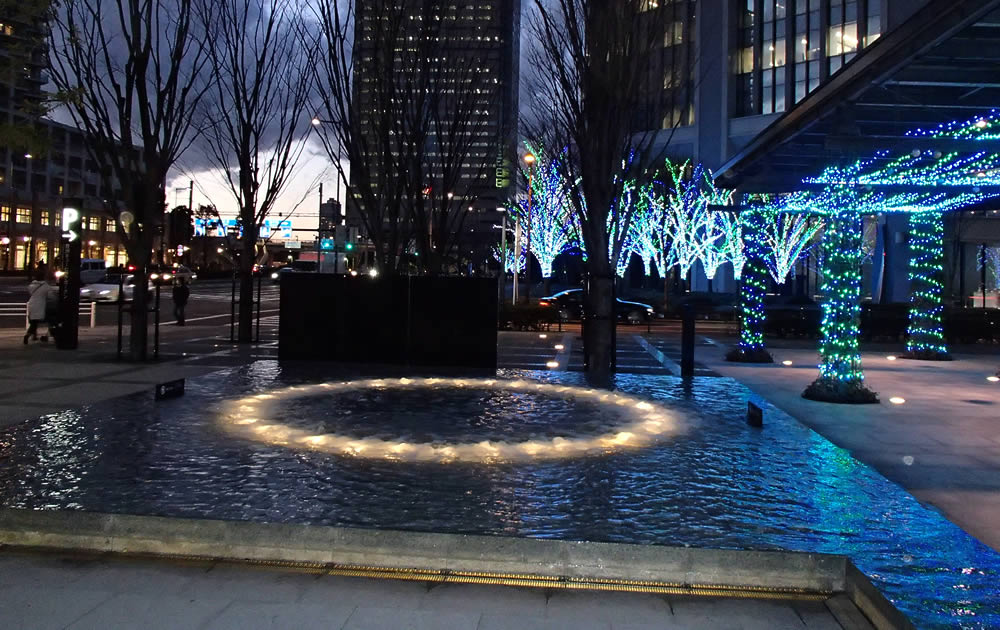 波打つ水面に幻想的な明りが灯る水盤のアート Water flows into the artistic pool which is bathed in magical light