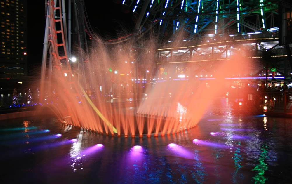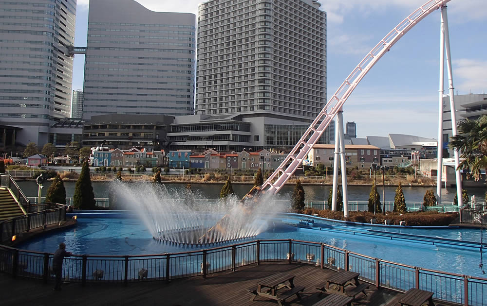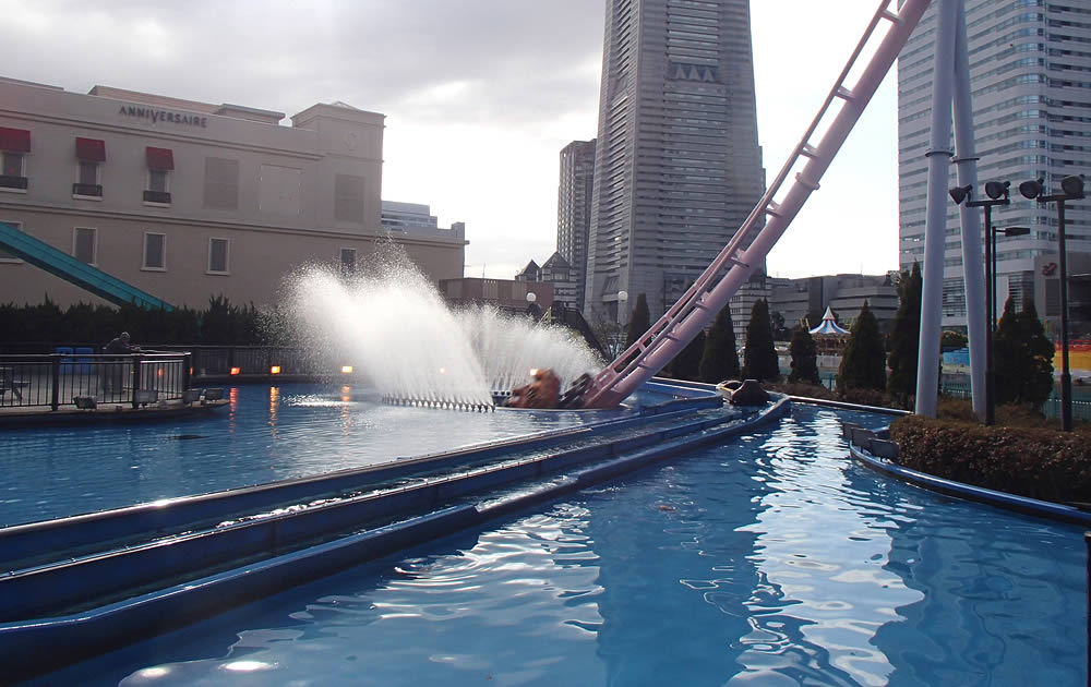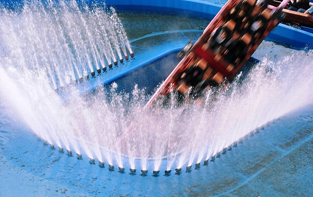 水面に飛び込む車両の豪快な水しぶきを演出 Exciting sheets of spray fly when the carriages plunge through the surface of the water
